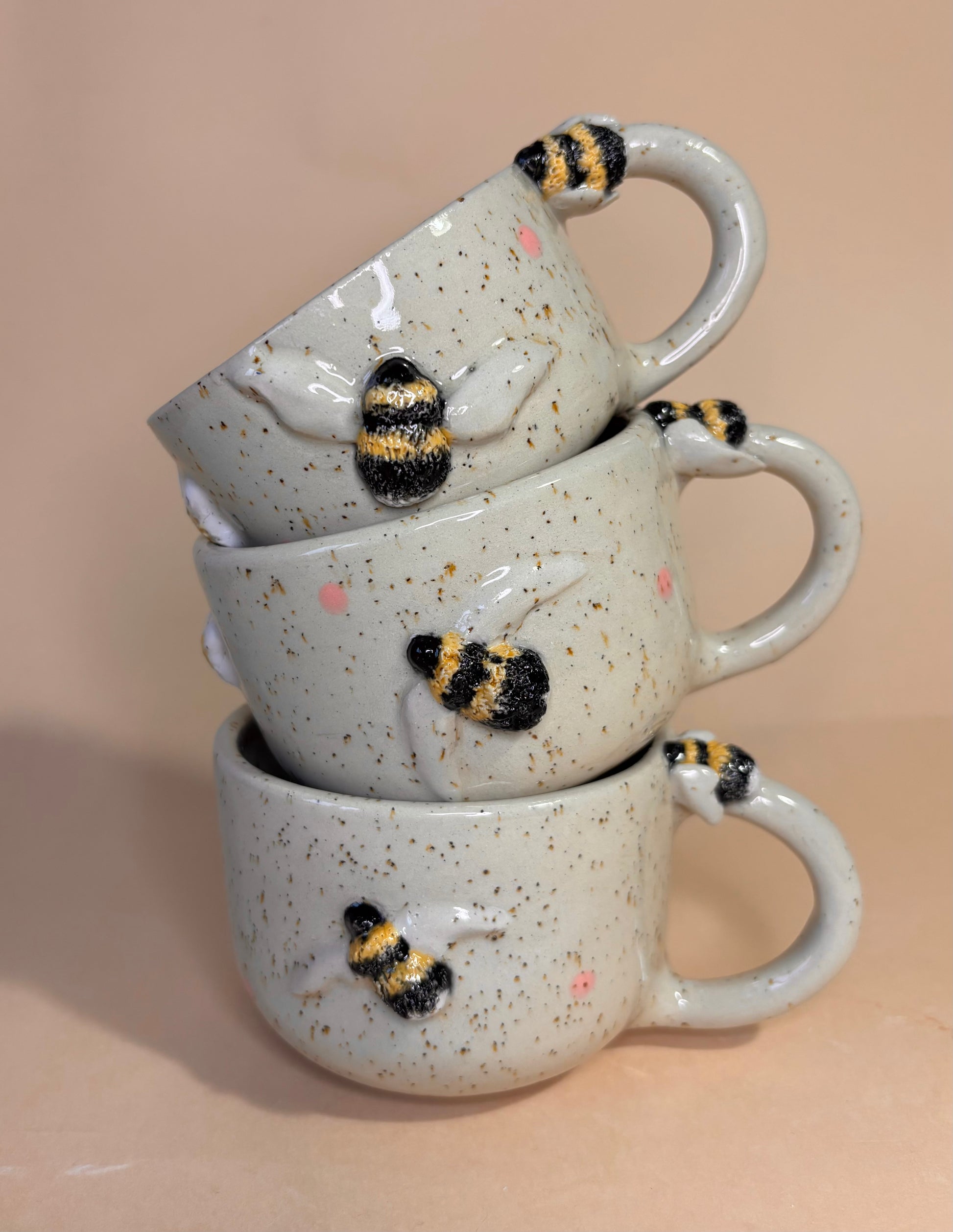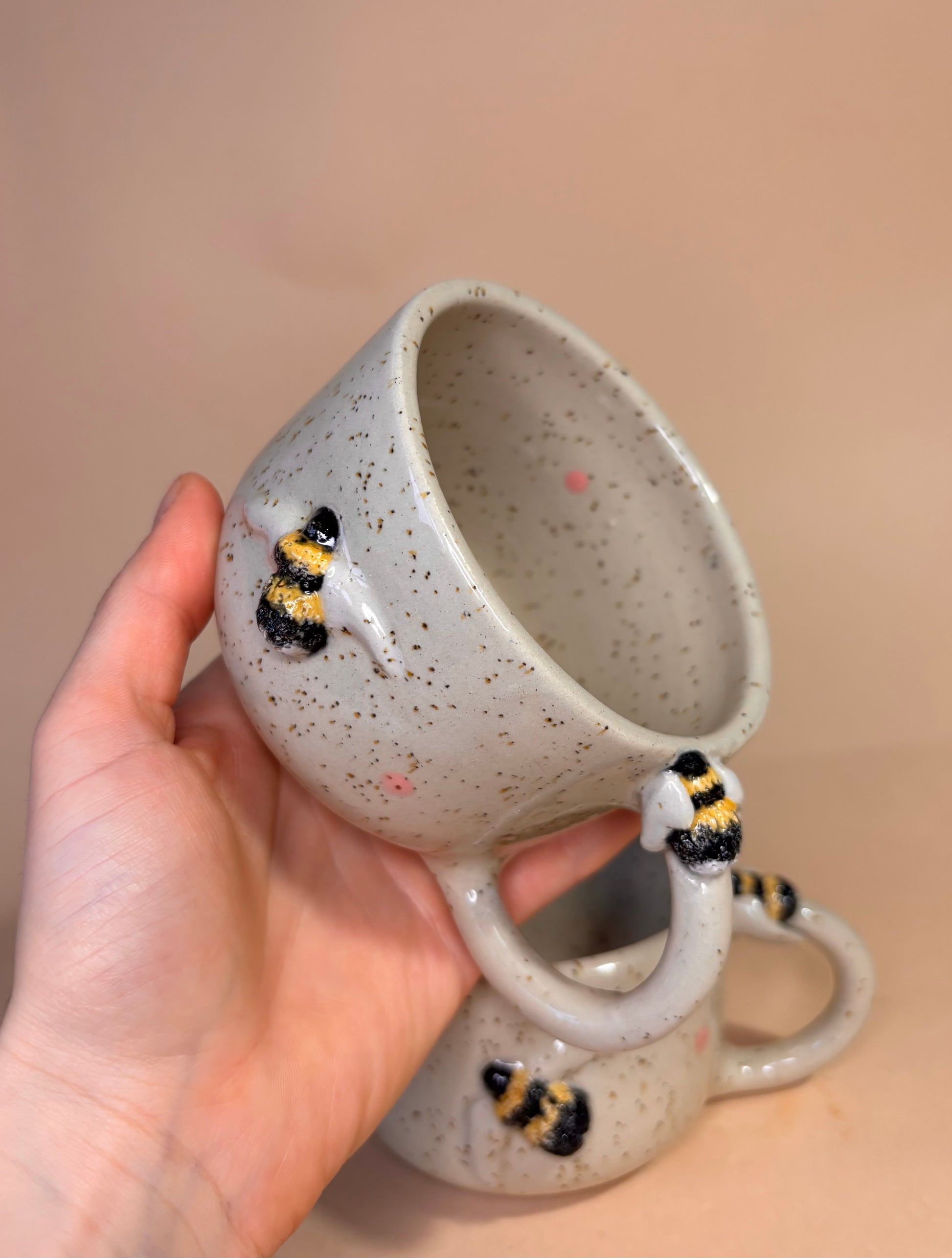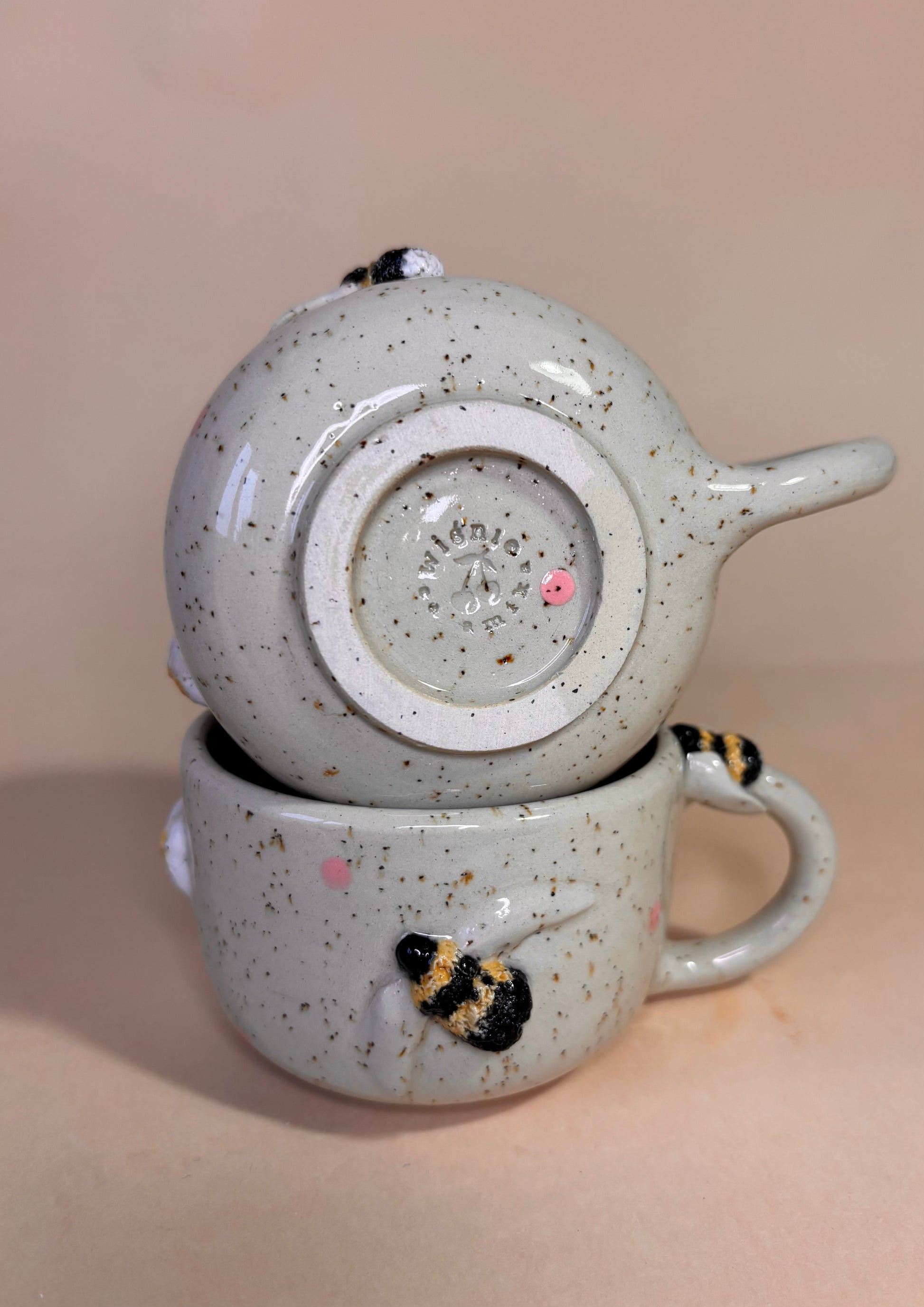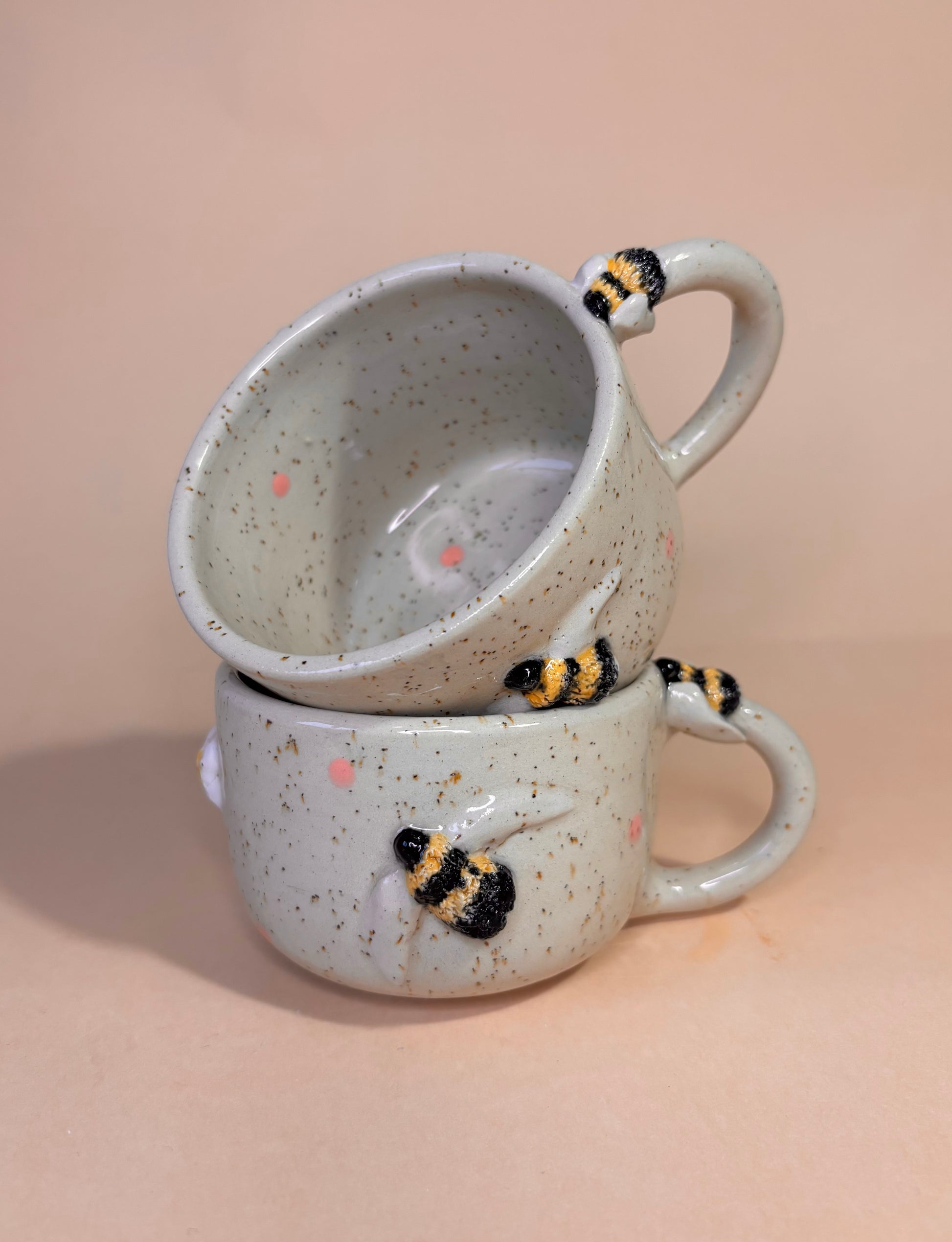 Kubek toczony na kole z lepionymi i malowanymi detalami.
