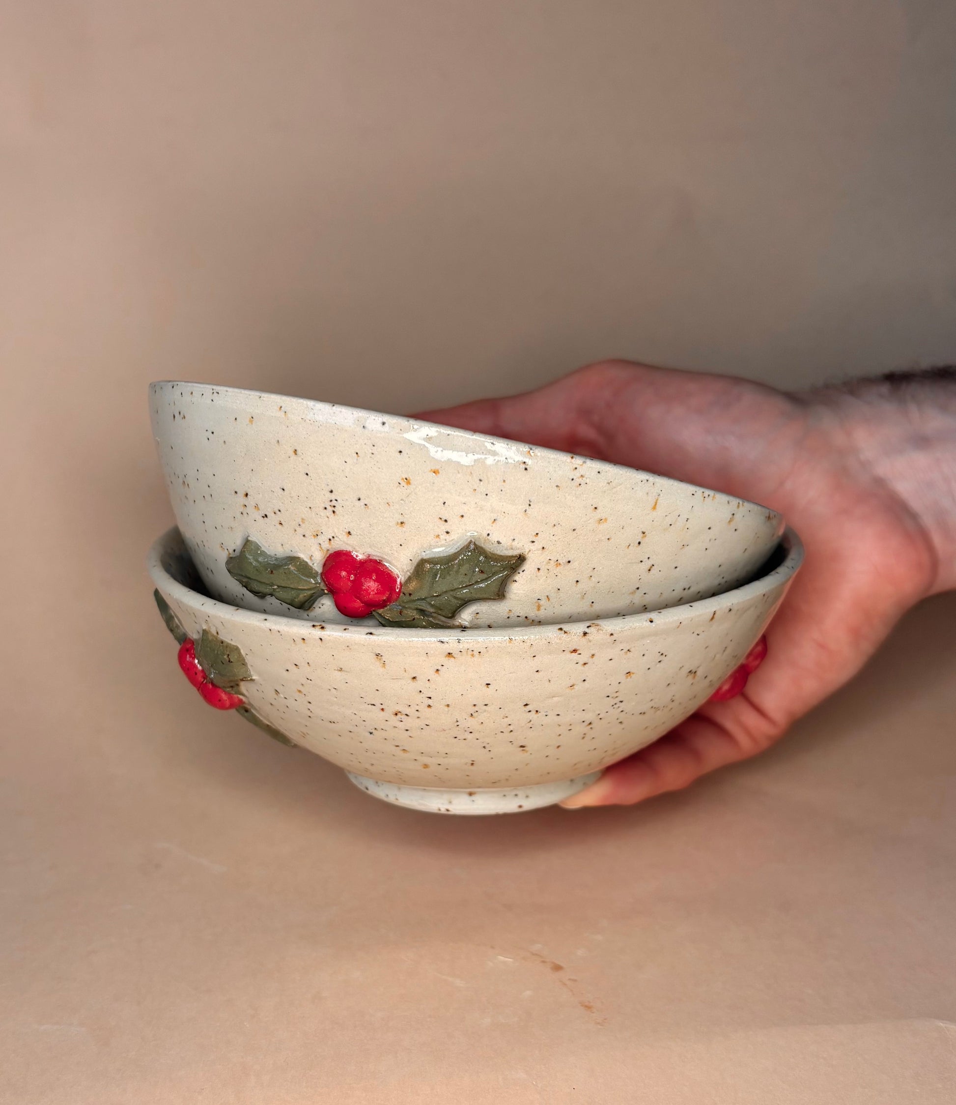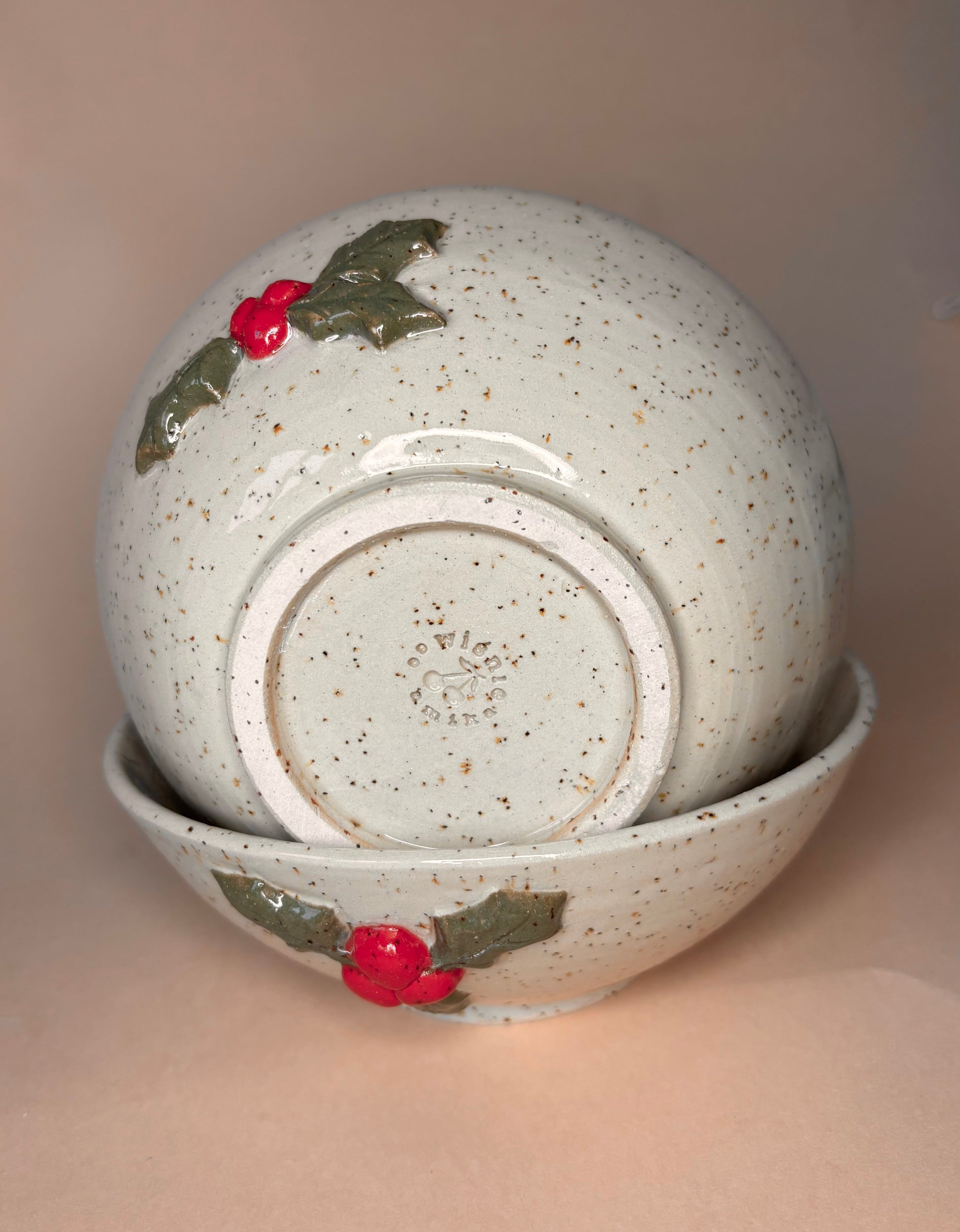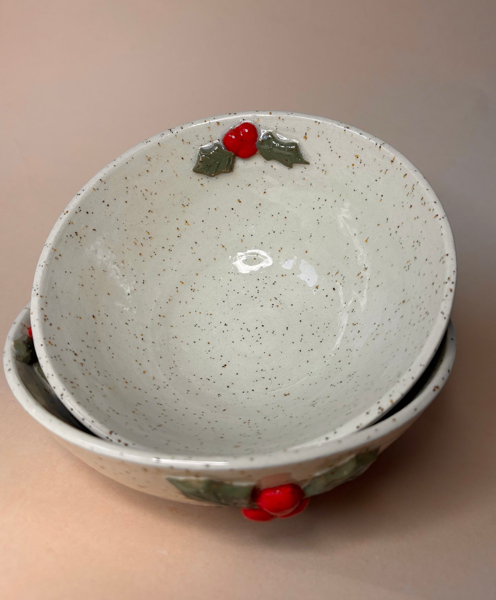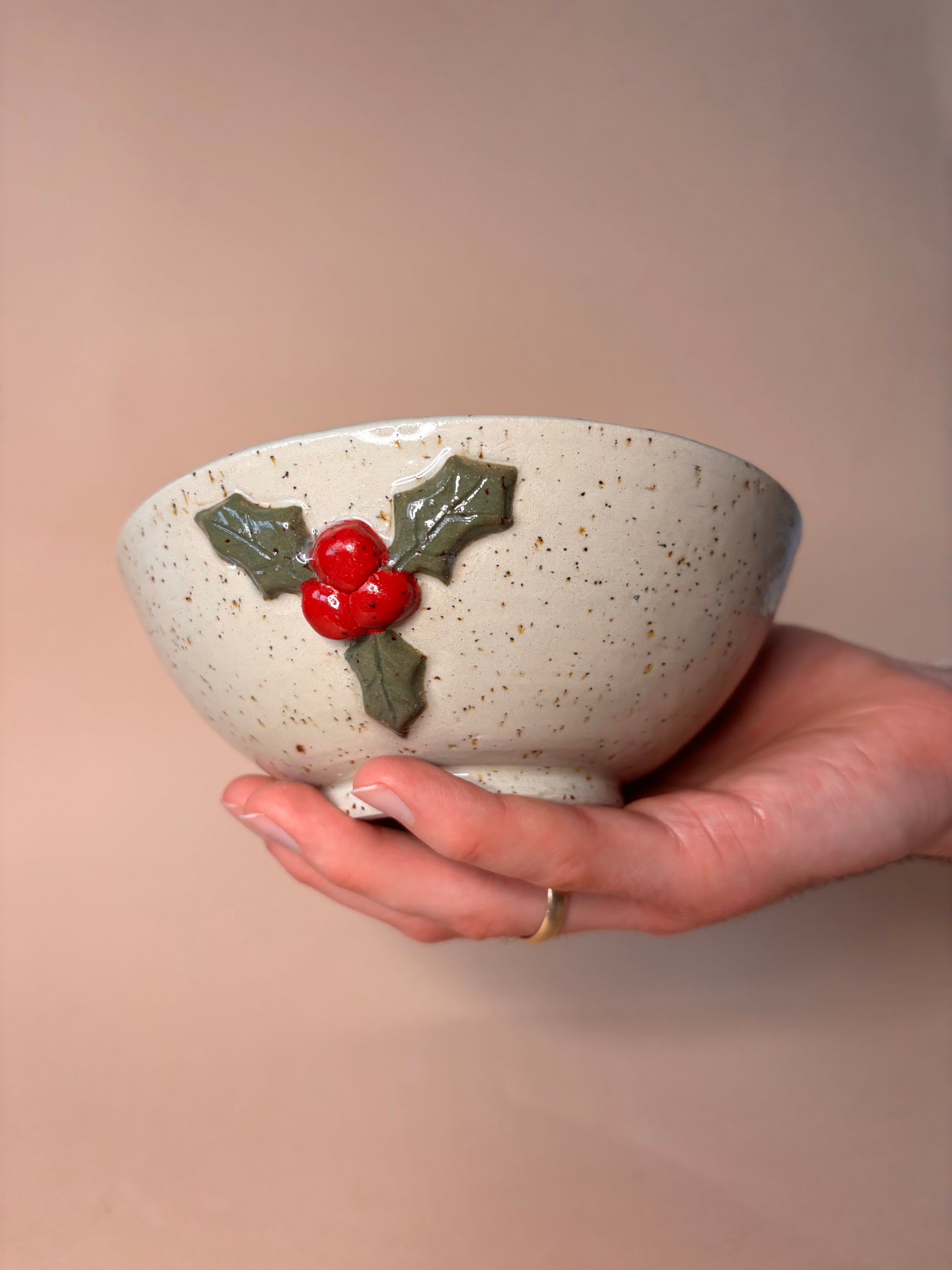 Toczona na kole miska z lepionymi detalami w kształcie ostrokrzewu.
