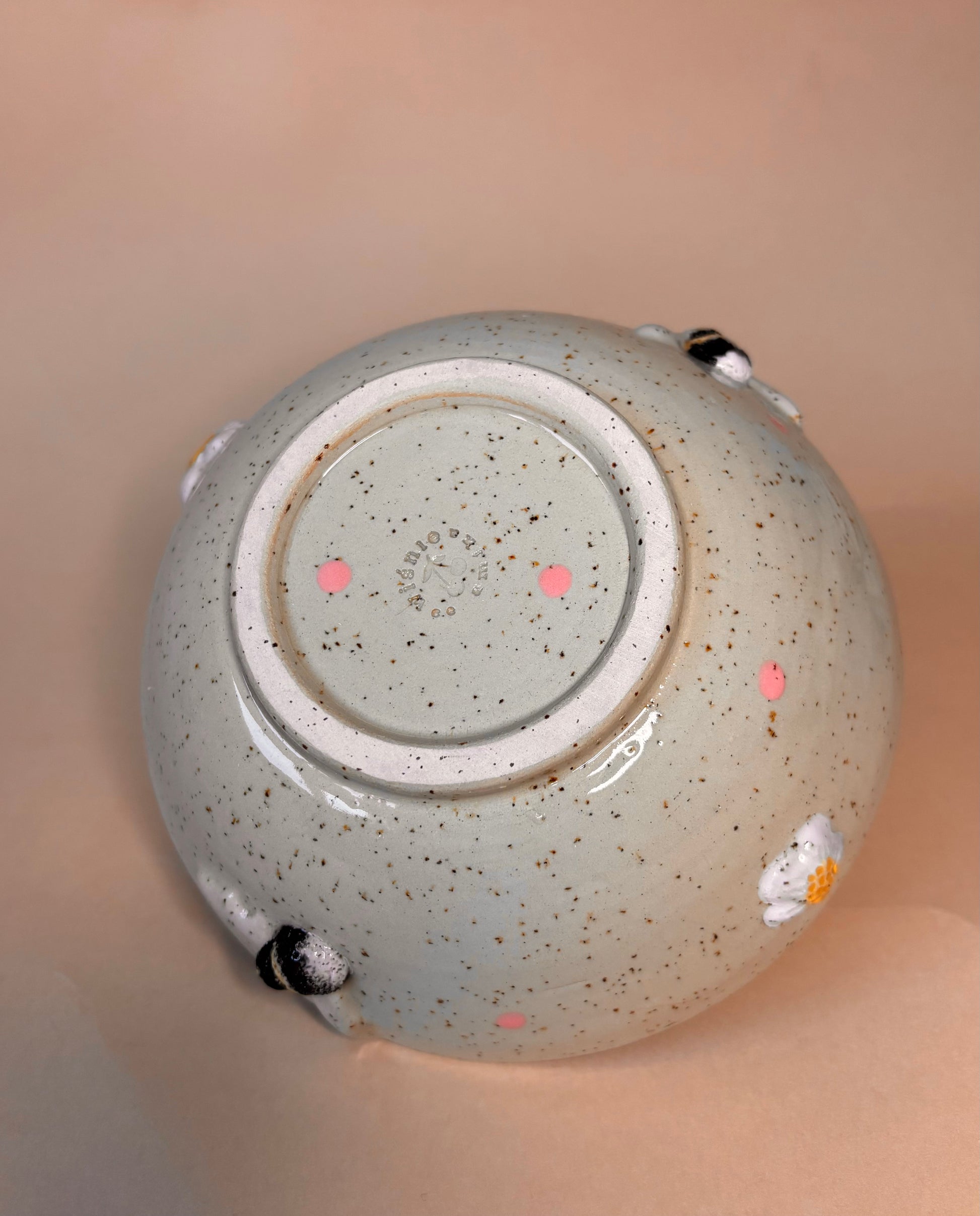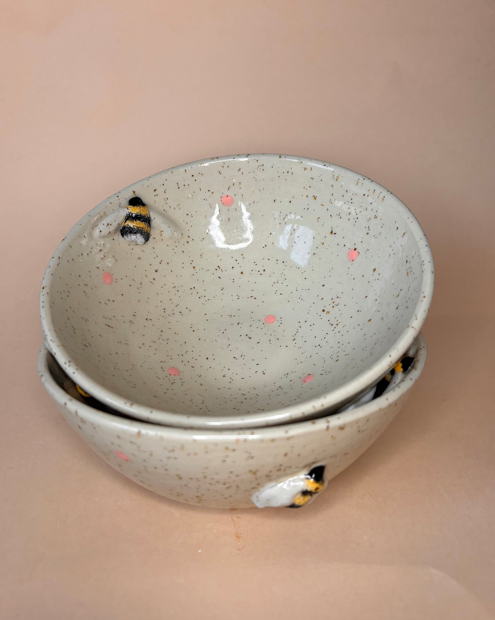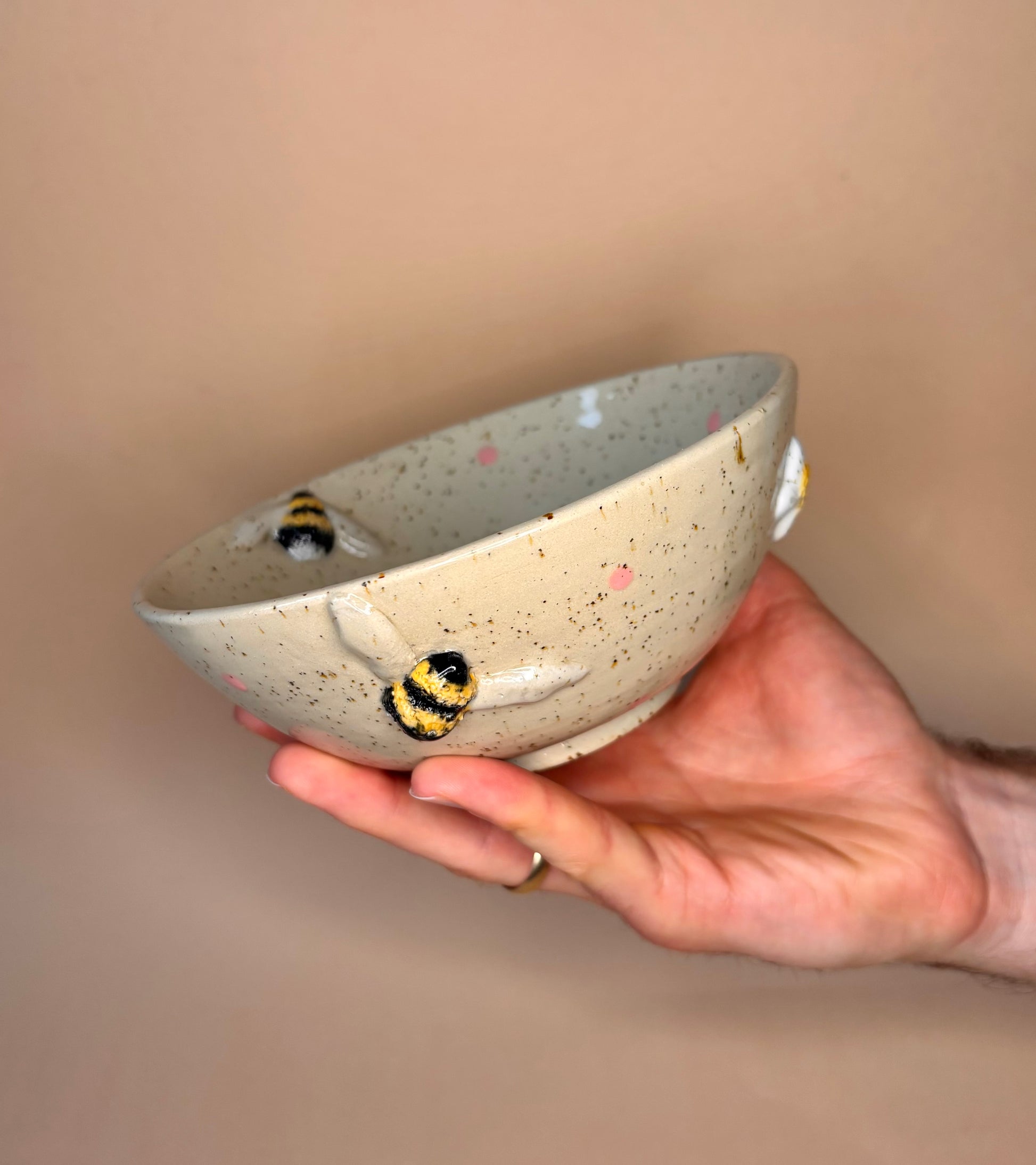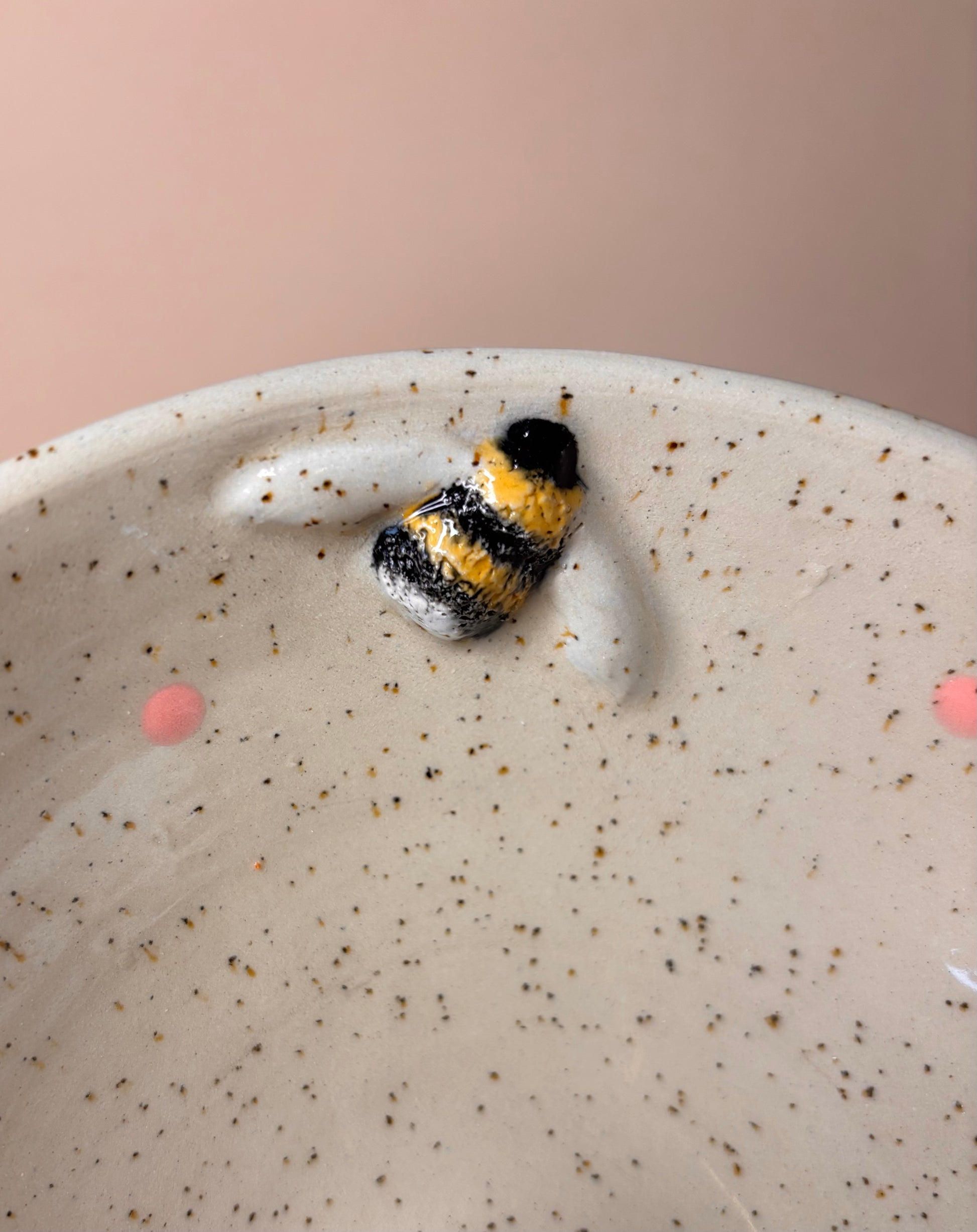 Toczona na kole miska z lepionymi detalami w kształcie trzmieli.
