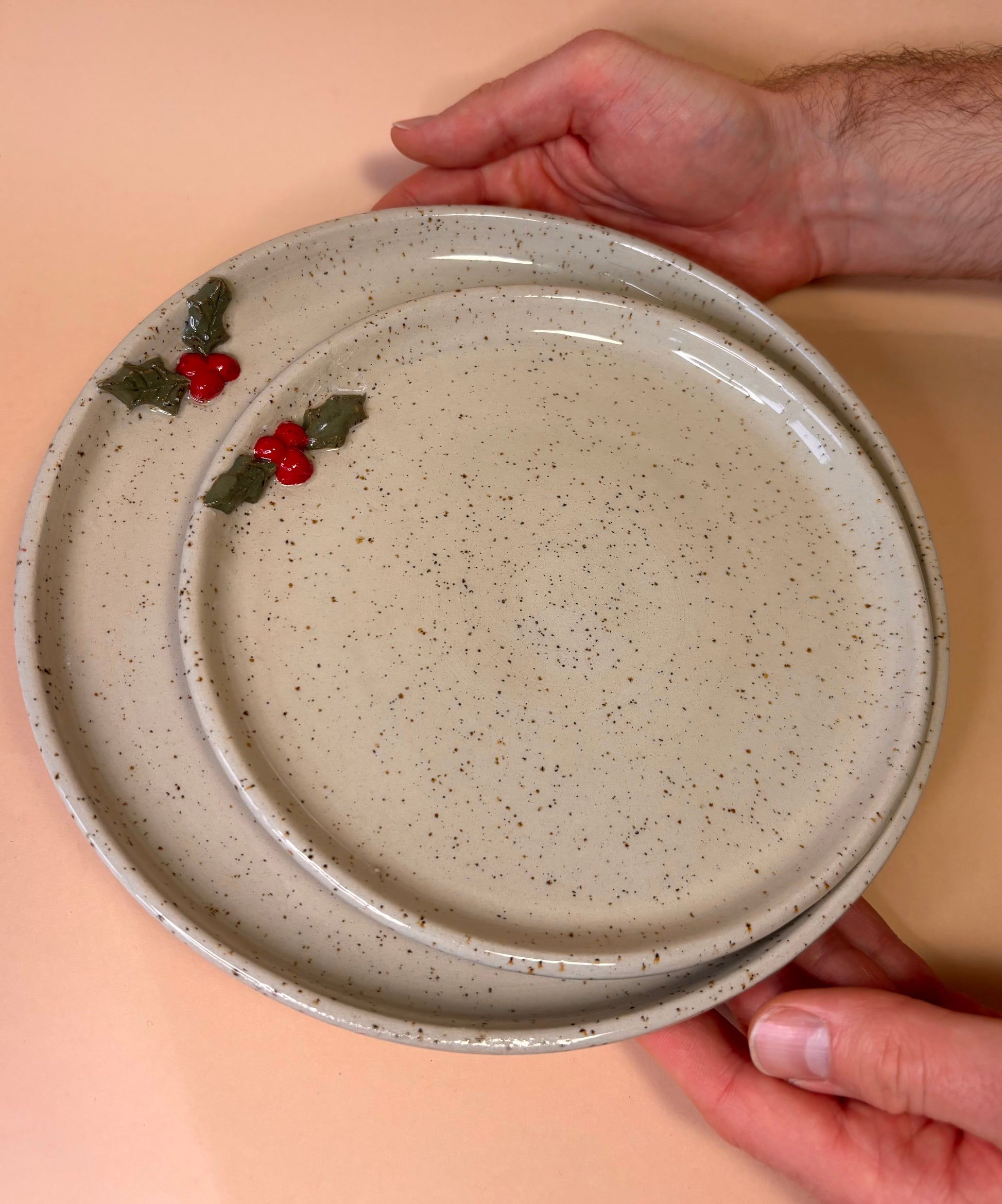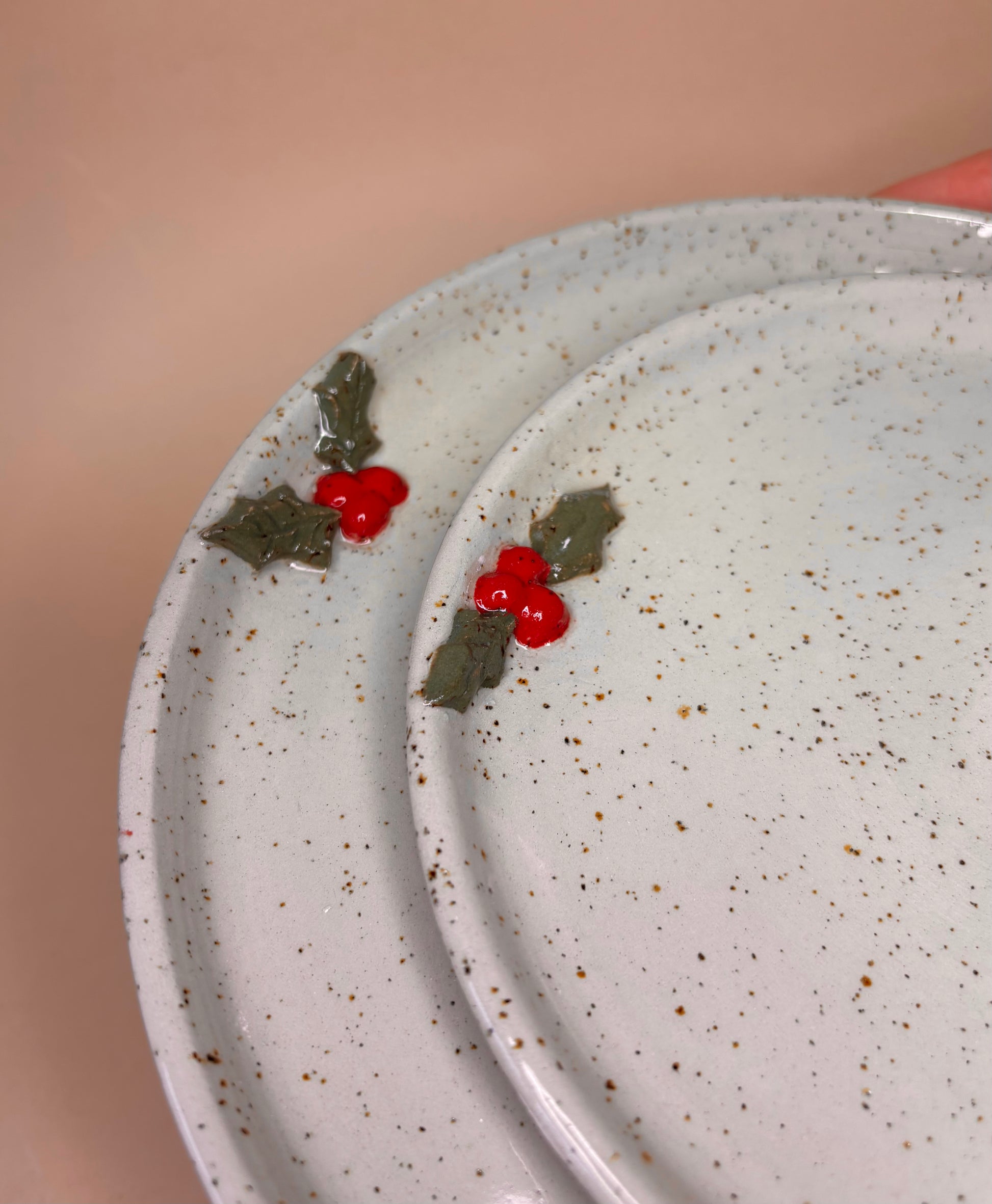 Talerz ceramiczny toczony na kole z lepionymi detalami w kształcie ostrokrzewu.